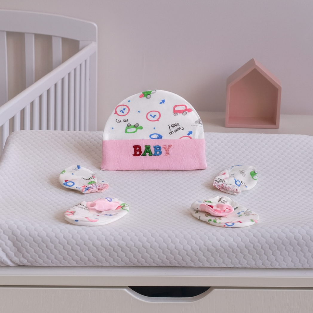 Keep your newborn cozy and protected with the Let's Adore combo set, thoughtfully designed with 100% soft cotton to be gentle on delicate skin. This adorable 3-piece set includes a cap, pair of mittens, and booties, perfect for everyday wear during your baby’s early months.